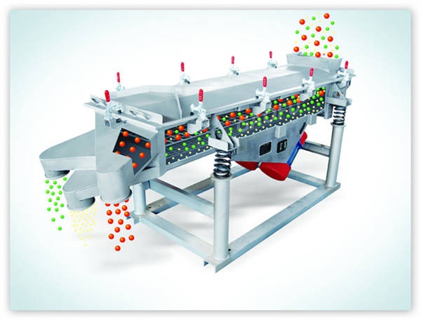 直線振動(dòng)篩(以下稱直線篩)利用振動(dòng)電機(jī)激振作為振動(dòng)源,使物料在篩網(wǎng)上被拋起,同時(shí)向前作直線運(yùn)動(dòng),物料從給料機(jī)均勻地進(jìn)入篩分機(jī)的進(jìn)料口,通過多層篩網(wǎng)產(chǎn)生數(shù)種規(guī)格的篩上物、篩下物、分別從各自的出口排出。具有耗能低、產(chǎn)量高、結(jié)構(gòu)簡單、易維修、全封閉結(jié)構(gòu),無粉塵溢散,自動(dòng)排料,更適合于流水線作業(yè)。